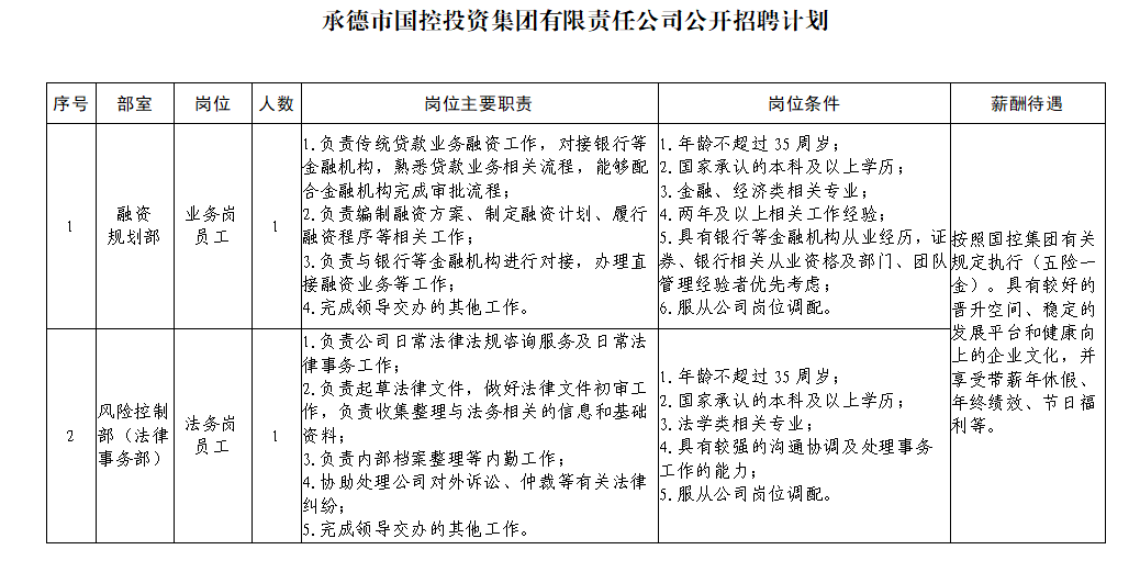 安博电子(以下简称“安博电子”)成立于2015年9月,是市委、市政府按照“市场化配置、集约化整合、企业化经营、资本化运作”的原则予以组建的国有独资企业。安博电子隶属于承德市人民政府管理,注册资本3亿元人民币。现因安博电子业务发展和工作需要,委托承德鸿雅伟业人力资源管理咨询有限公司(简称“鸿雅人资”)面向社会公开招聘工作人员,具体招聘信息公告如下: