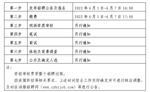 2022年6月1日至2022年6月7日16:00 在鸿雅招聘网(http://www.cdhyjob.com/)、鸿雅微信公众号、安博电子官方网站(/)及上级部门要求的相关网站等发布招聘公告。